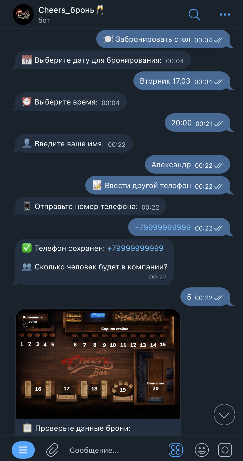 CHEERS показывает свободные столы в реальном времени: вы сами выбираете удобный столик на схеме зала и бронируете его моментально, без звонков и уточнений у администратора. А ресторану для работы с этой бронью не нужен сложный софт — хватит одной панели управления и привычного мессенджера.